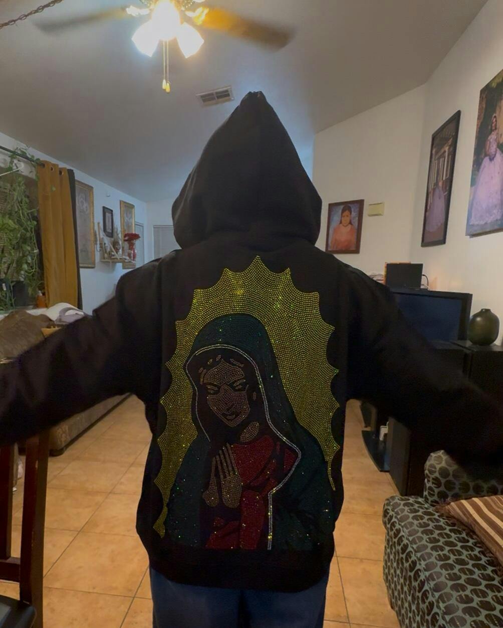 The hoodie’s design is super clean and the rhinestones really stand out in person — definitely eye-catching and great quality overall. The material feels nice and warm, and the fit is true to size. Only small downsides: the zipper was a little stiff at first, and the hood shape looks kind of weird (almost like a witch hat 😂). But other than that, it’s a solid piece and worth it for the price.